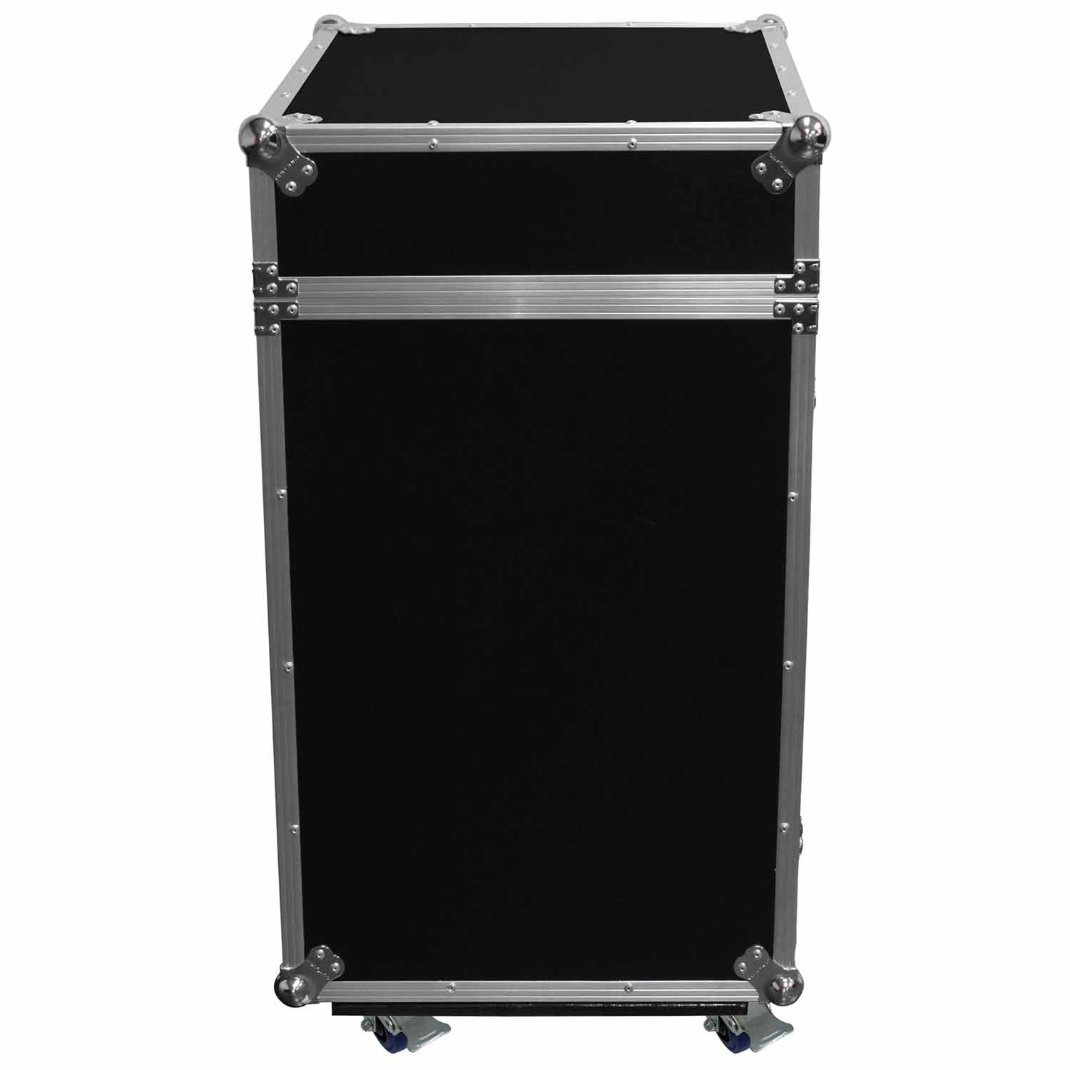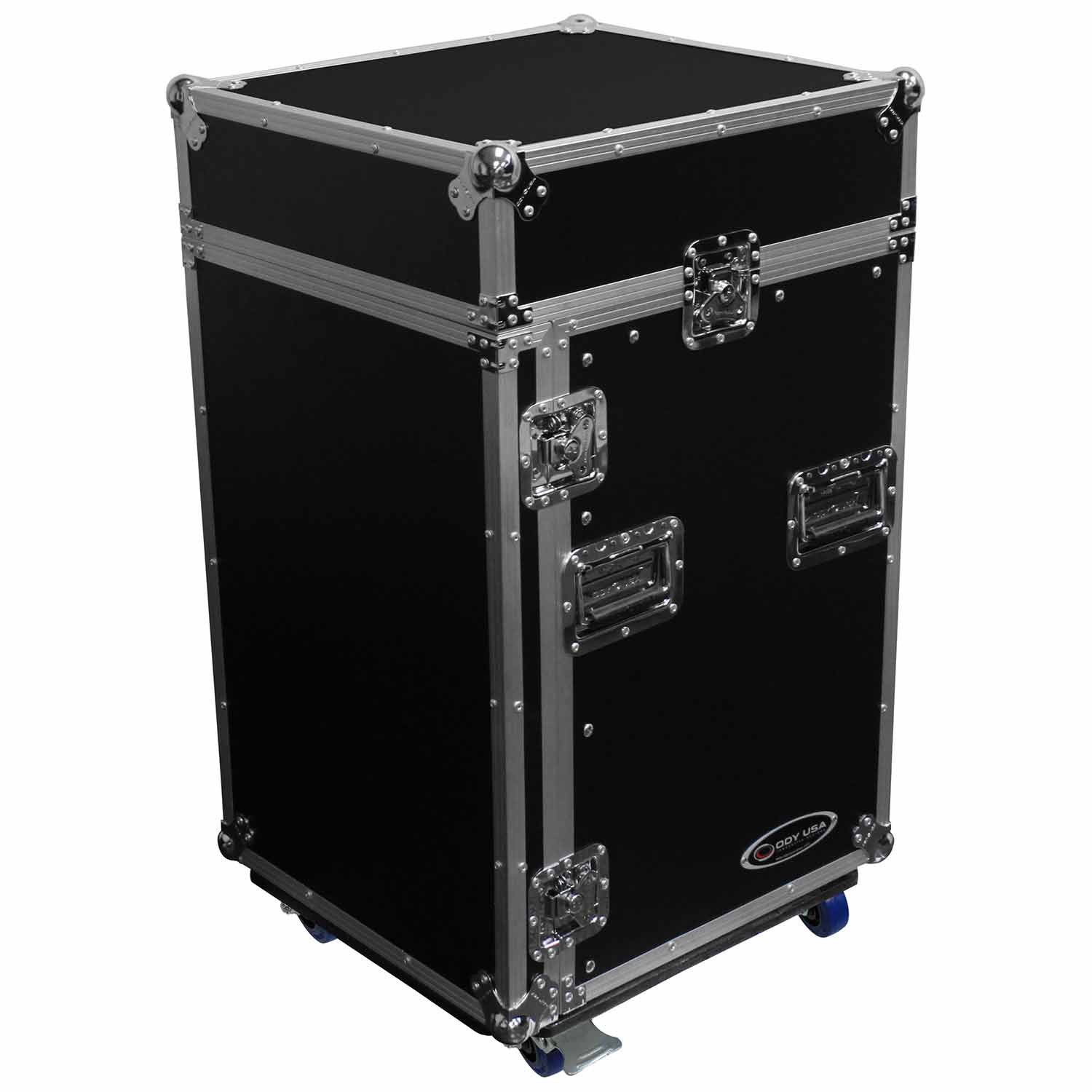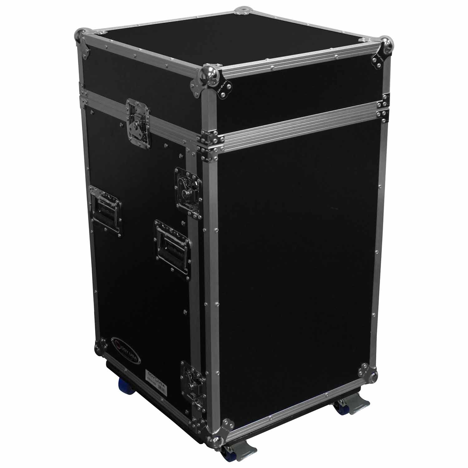 Our Combo Racks give you the best of both worlds. Mount mixers and controllers on top for convenient access and all other essentials below. Each features heavy-duty rubber feet (non-wheeled versions), spring-loaded handles, and recessed hardware. "W" versions feature heavy-duty casters on a dolly plate (2 with sure stop brakes).