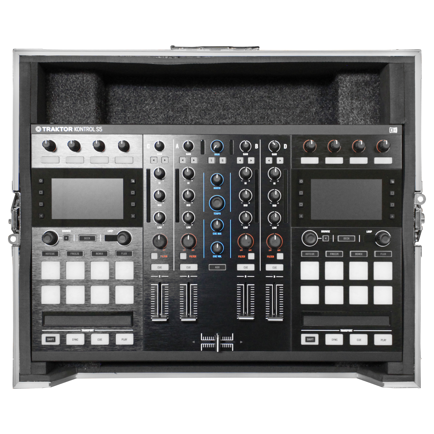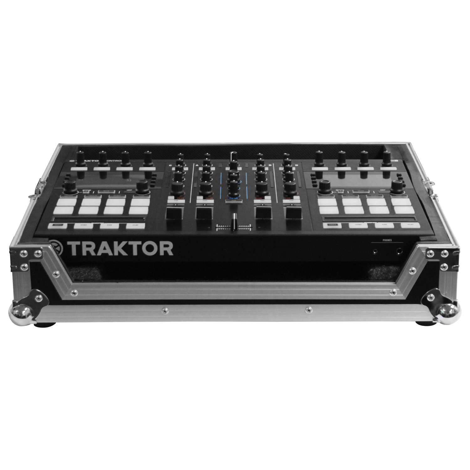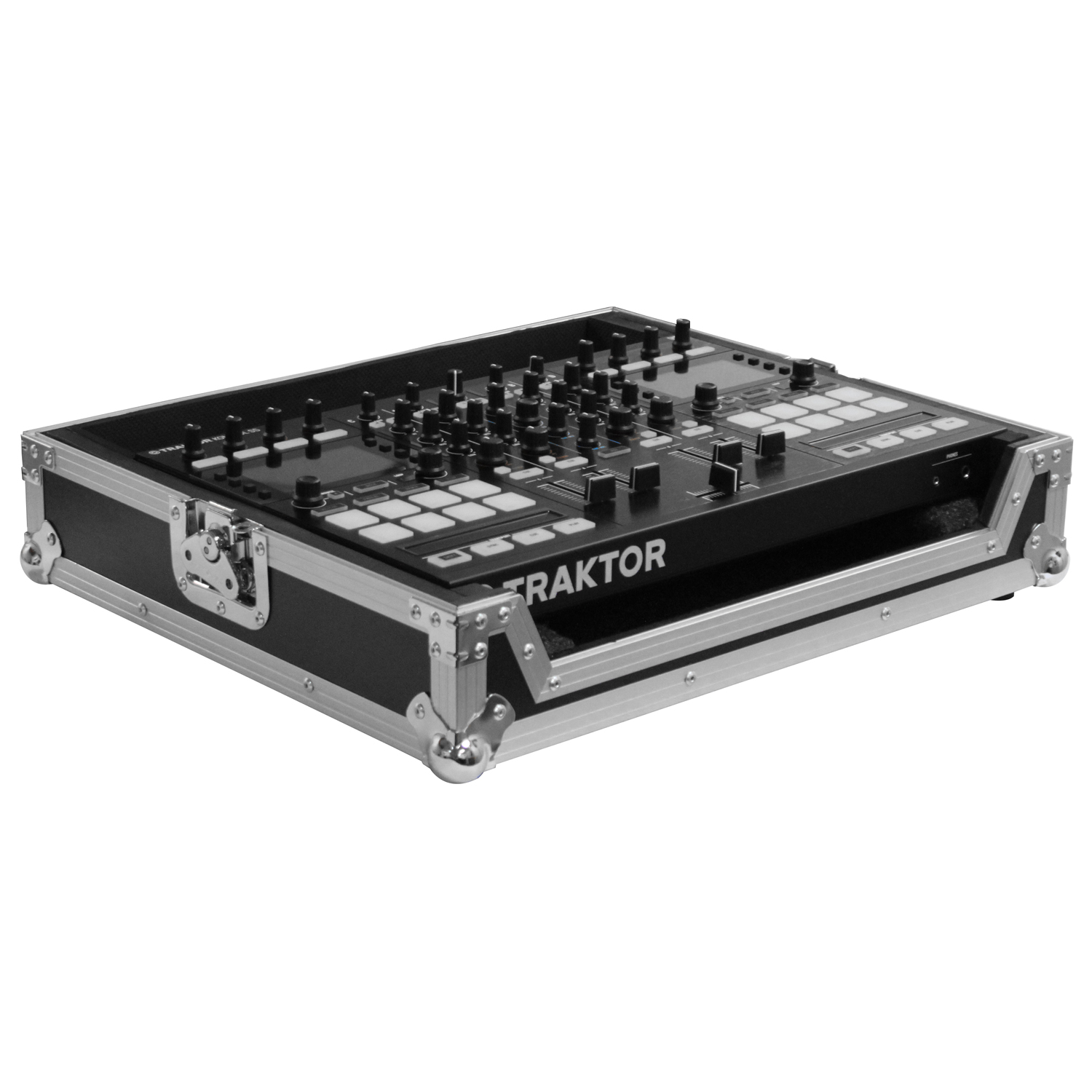The Odyssey Flight Ready™ series FRTS4 case is specifically designed to hold the Traktor Kontrol S4 / S4 MK2 and S5 DJ controllers. It features a front removable panel for easy access to the front input jacks and control knobs. Other features includes rubber feat, ball corners, and heavy-duty recessed handle and latches.