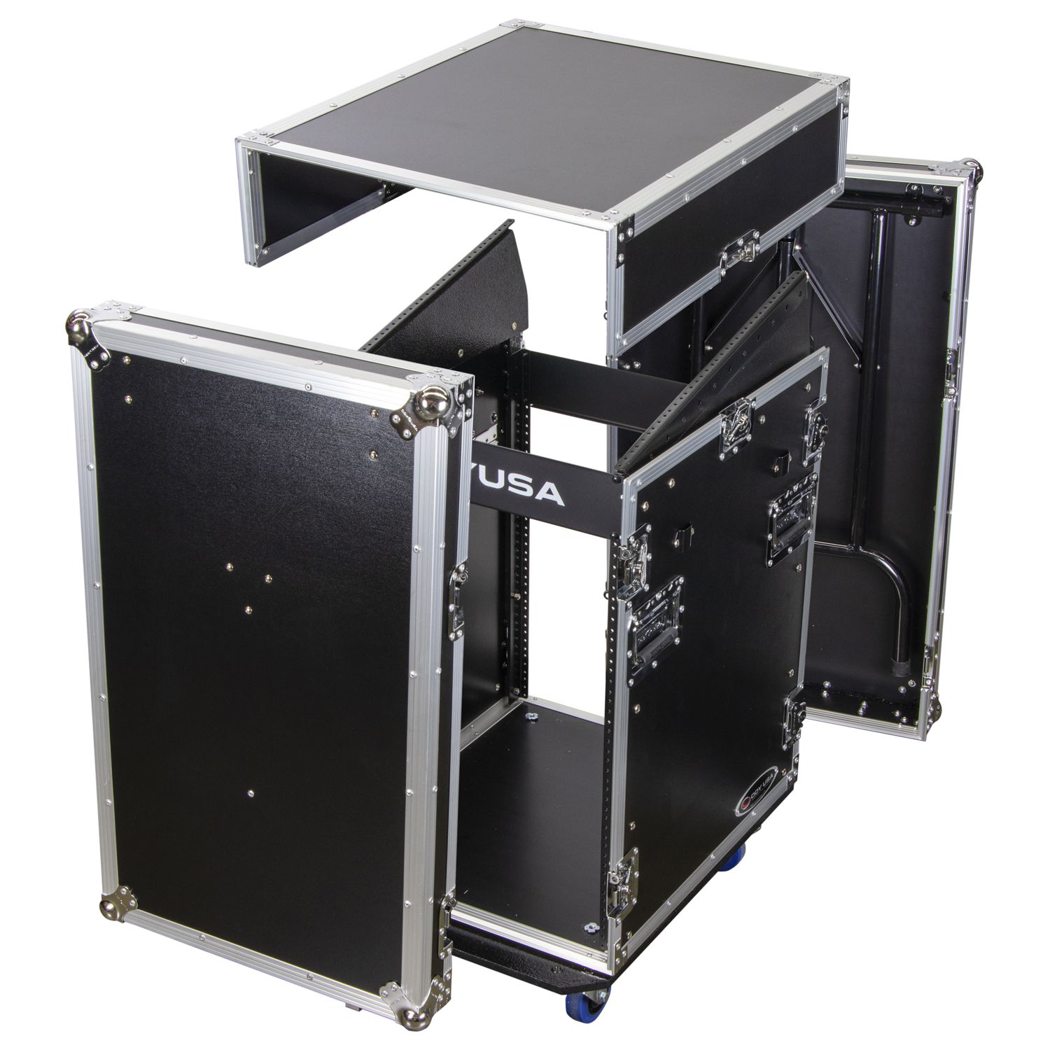 Our ATA Combo Racks give you the best of both worlds. Mount mixers and controllers on top for convenient access and all other essentials below. Each features heavy-duty rubber feet (non-wheeled versions), spring-loaded handles, and recessed hardware. "W" versions feature heavy-duty casters on a dolly plate (2 with sure stop brakes) while "DLX" versions feature lids that double as side mount workstation tables.