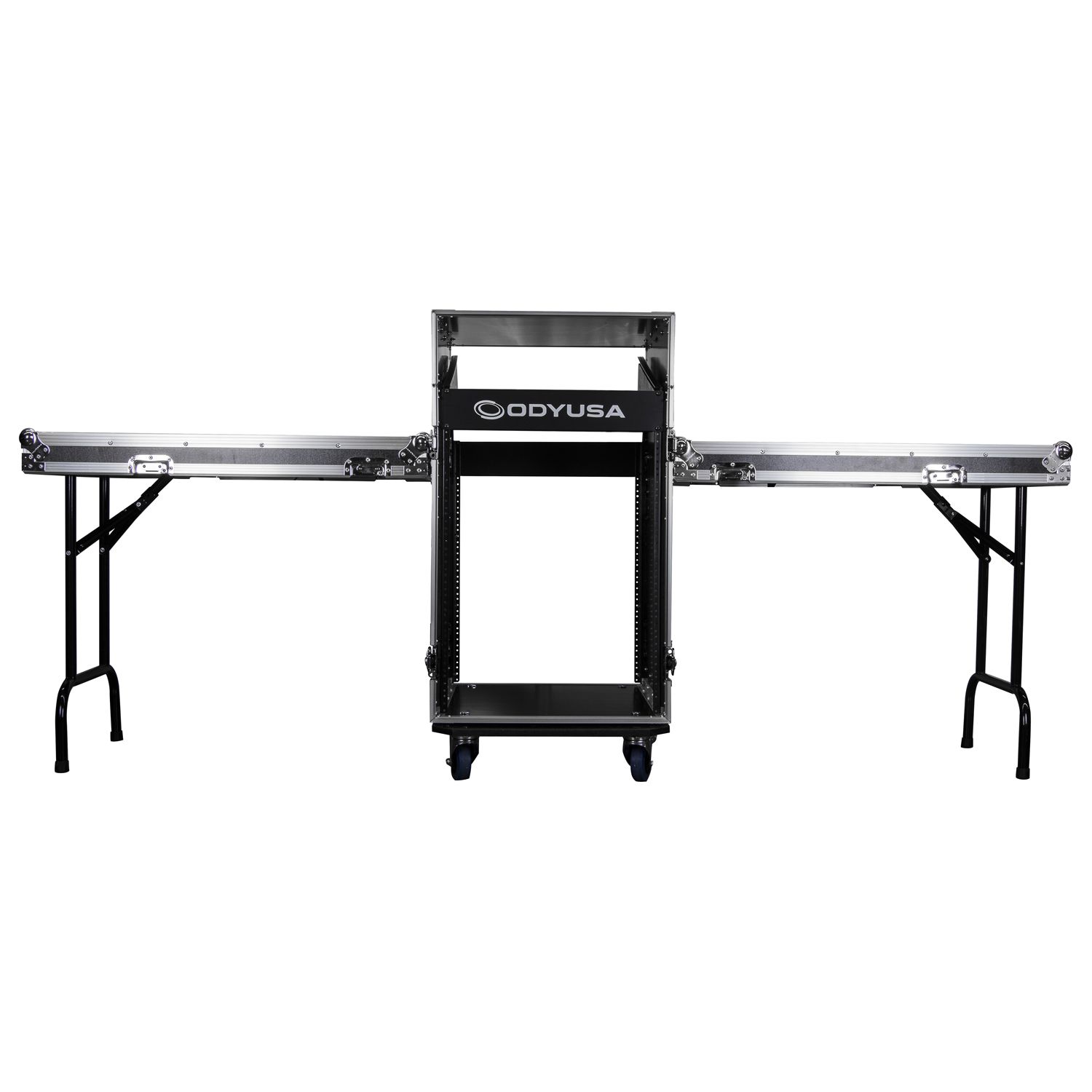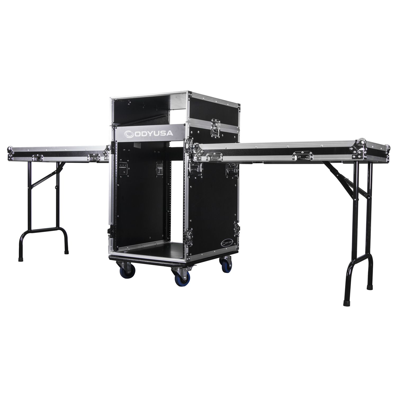 Deluxe 12U Top Slanted 14U Bottom Vertical Pro Combo Rack with Wheels and Two Side Tables