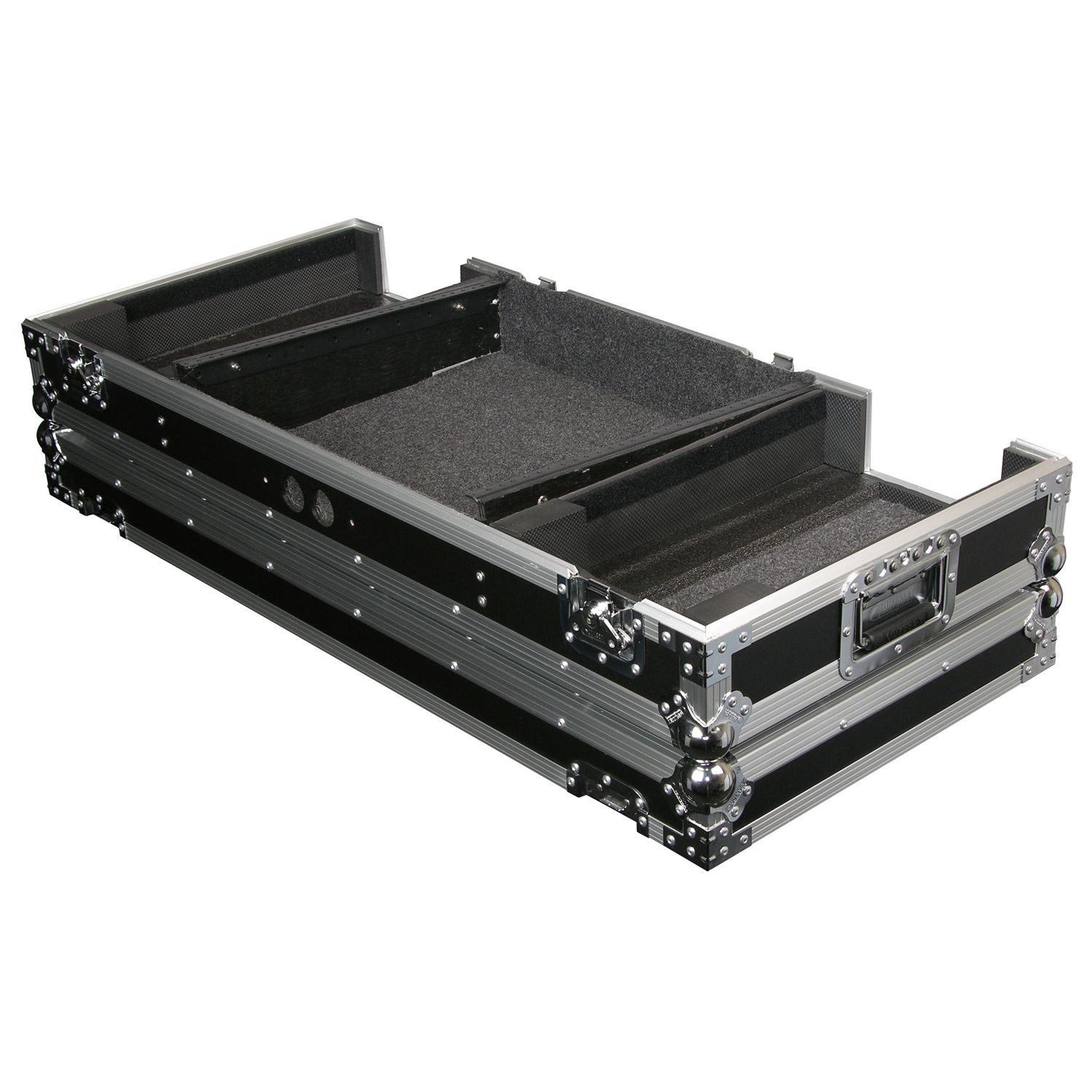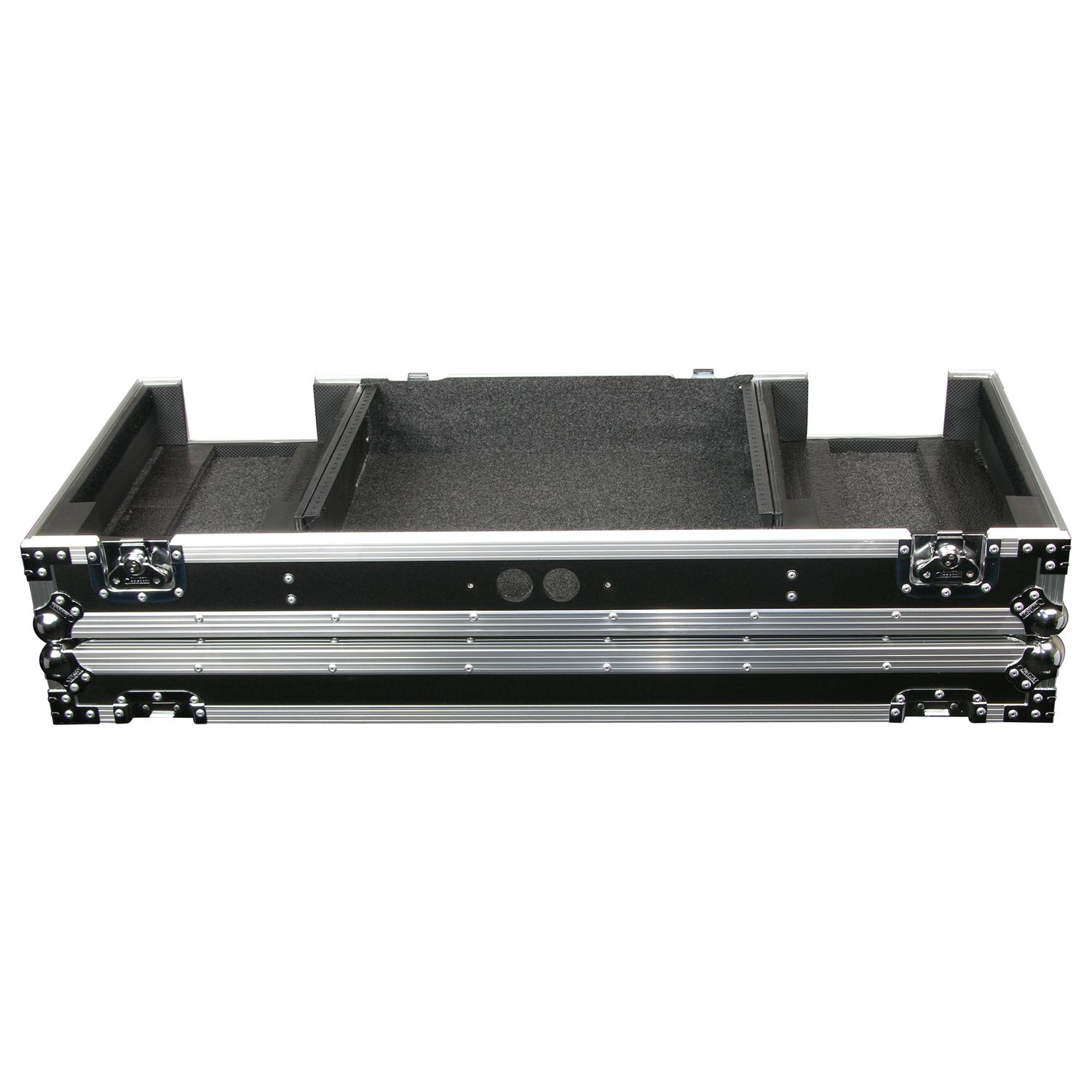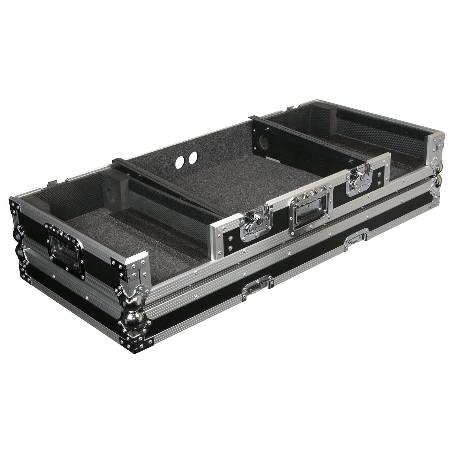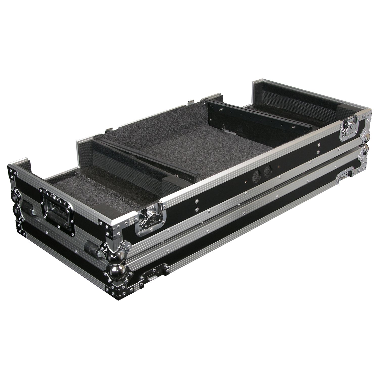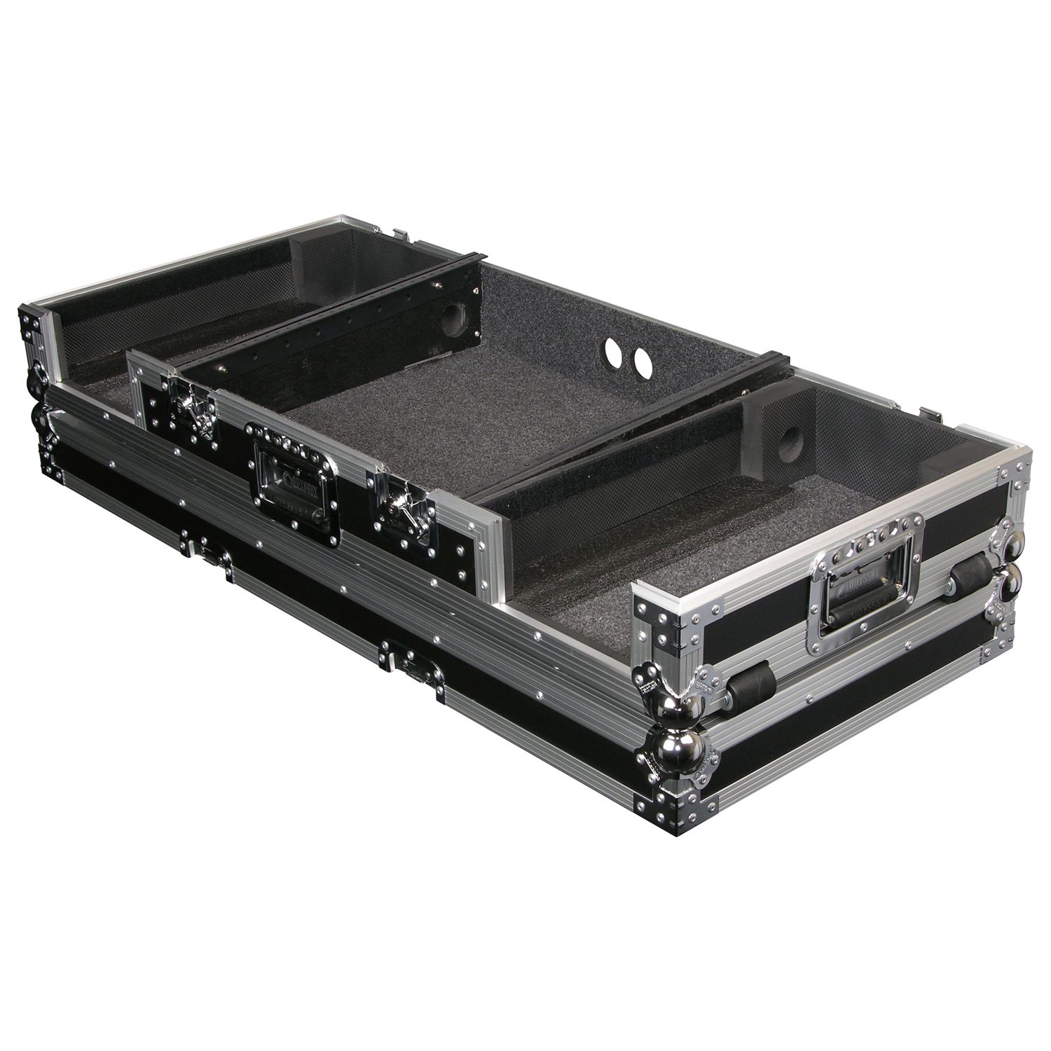 Our CD/digital media player DJ Coffins hold two large format tabletop CD/media players and one mixer. These ATA rolling coffins feature rugged built-in wheels, heavy-duty latches and spring-loaded handles, steel ball corners, and removable front access panels. Cabling is clean and easy through convenient access ports throughout.