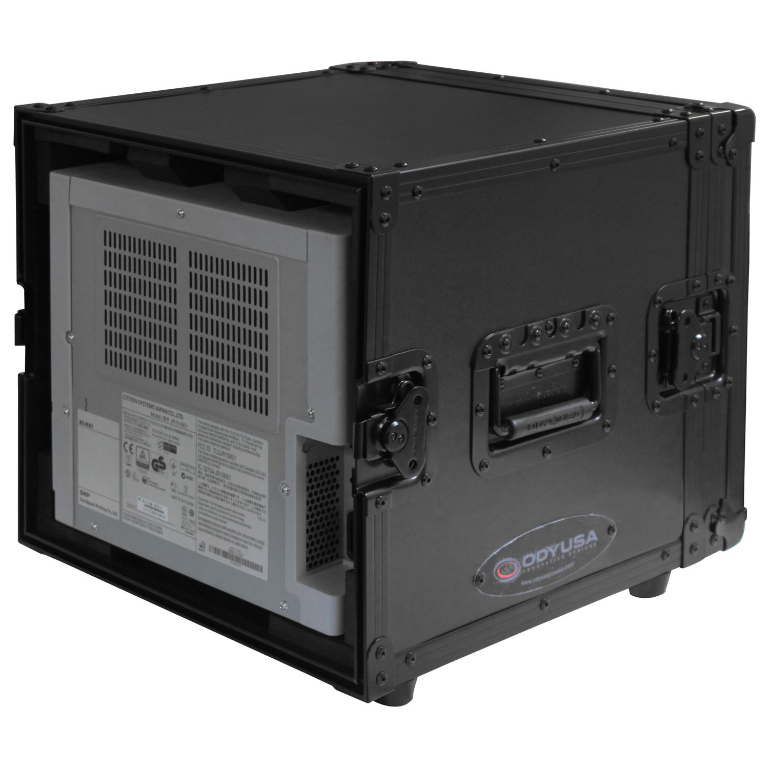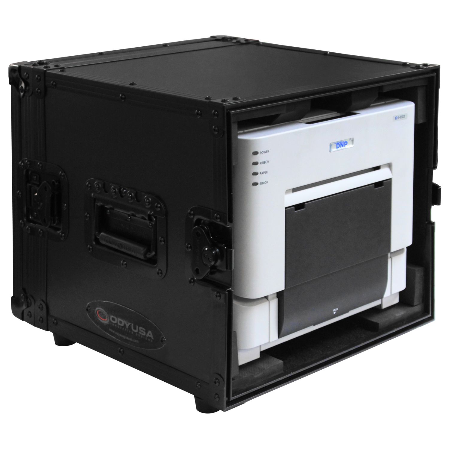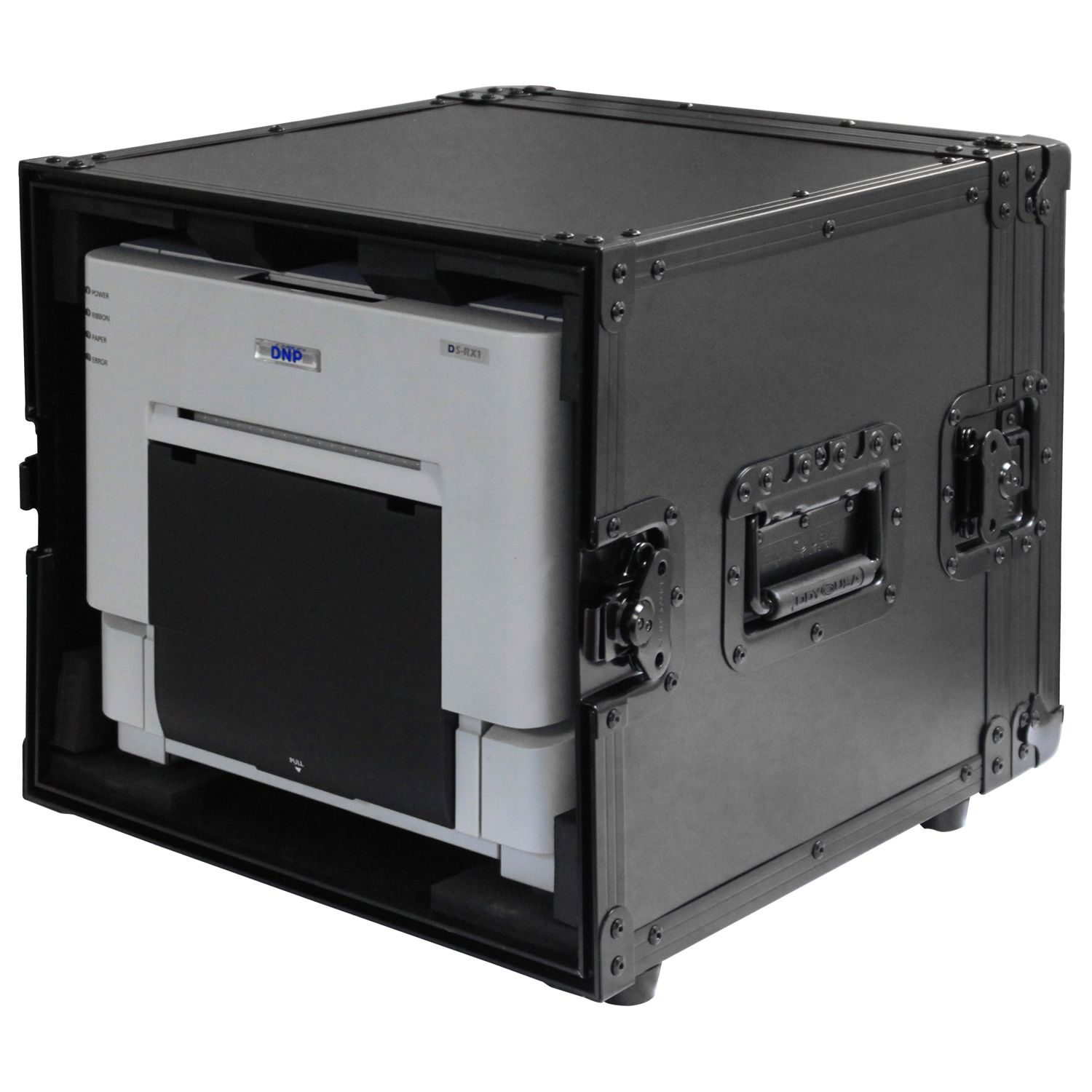 The Black Label™ Series FZDNPRX1BL is specifically designed to hold DNP DS-RX1 dye sublimation printer. The front and rear removable door design is perfectly designed for easy access to media loading, prints, the power switch, and rear cable port. There's no need to worry about ventilation with the doors removed and interior space all around the printer. Other features include heavy-duty recessed hardware, sure grip bottom rubber feet, and shock resistant interior foam.