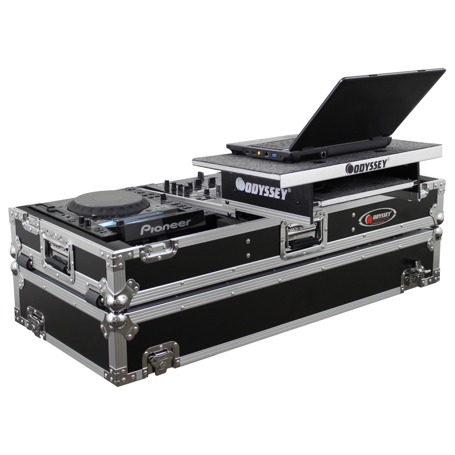 Odyssey Glide Style™ CD/digital media coffins hold two large format tabletop CD/media players and one mixer. Each compartment features a bottom valley or pit that allows for more ventilation of the gear as well as an area for cable management or storage. Other features include rugged built-in wheels, spring-loaded latches, heavy-duty ball corners, and removable front access panels. Cabling is clean and easy through convenient access ports throughout.