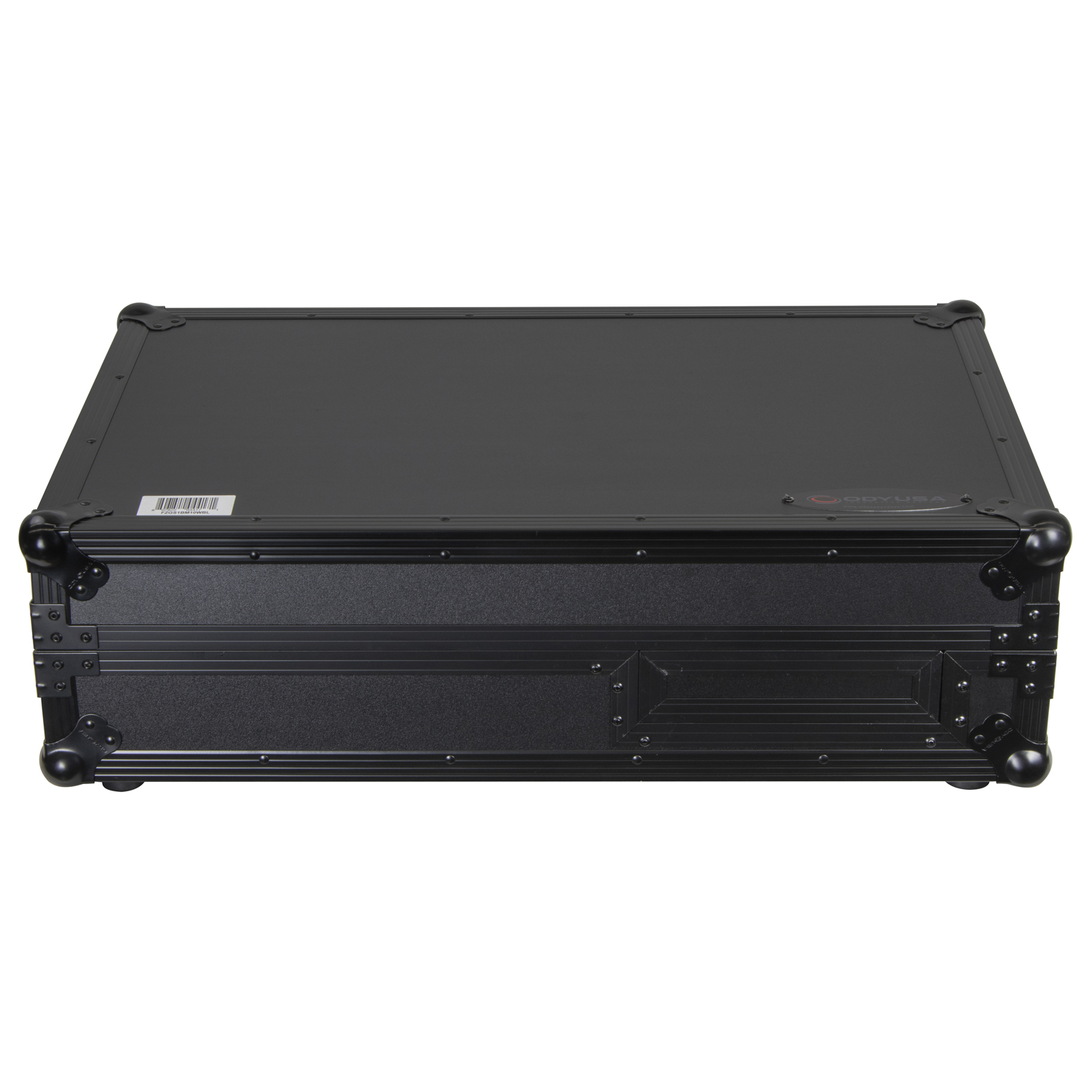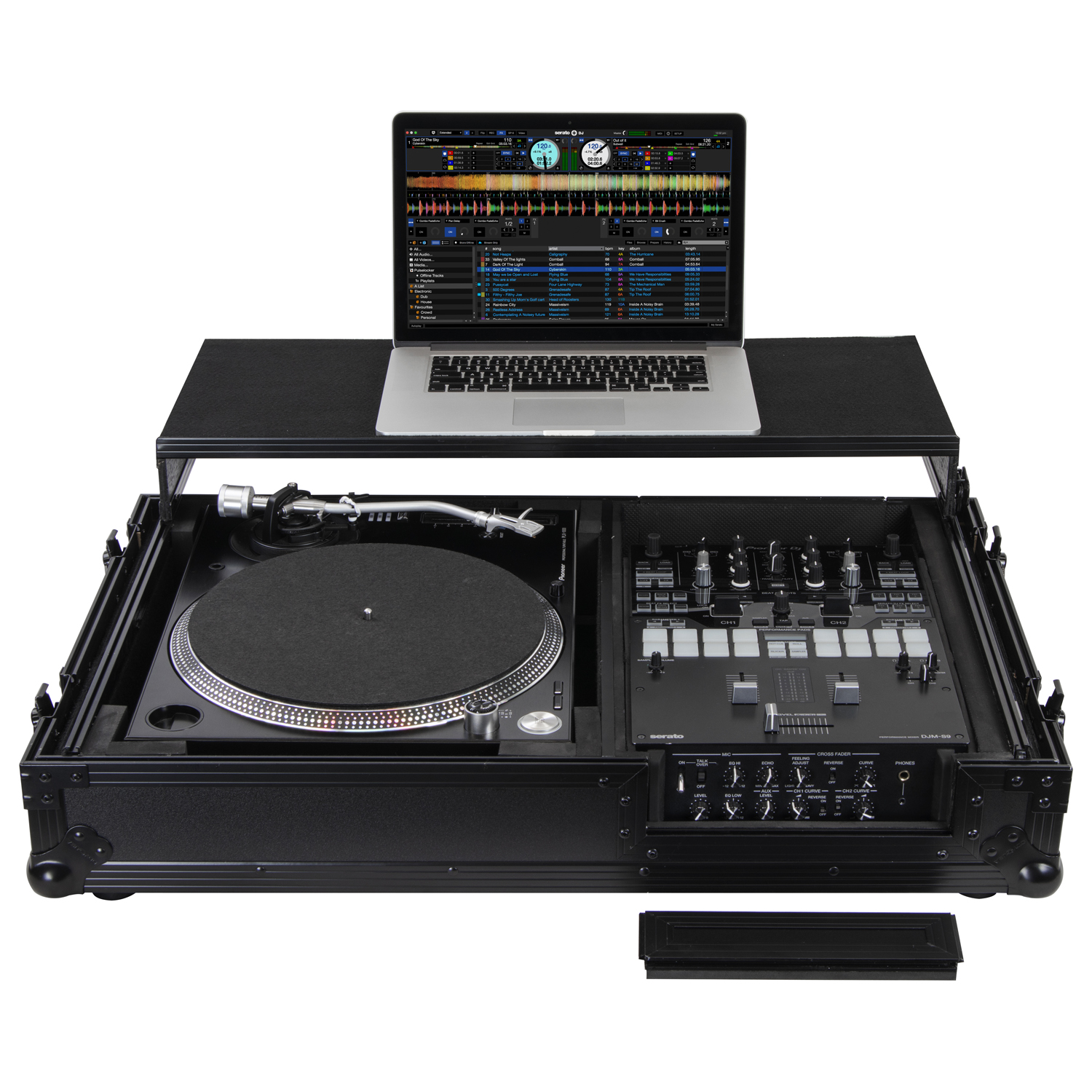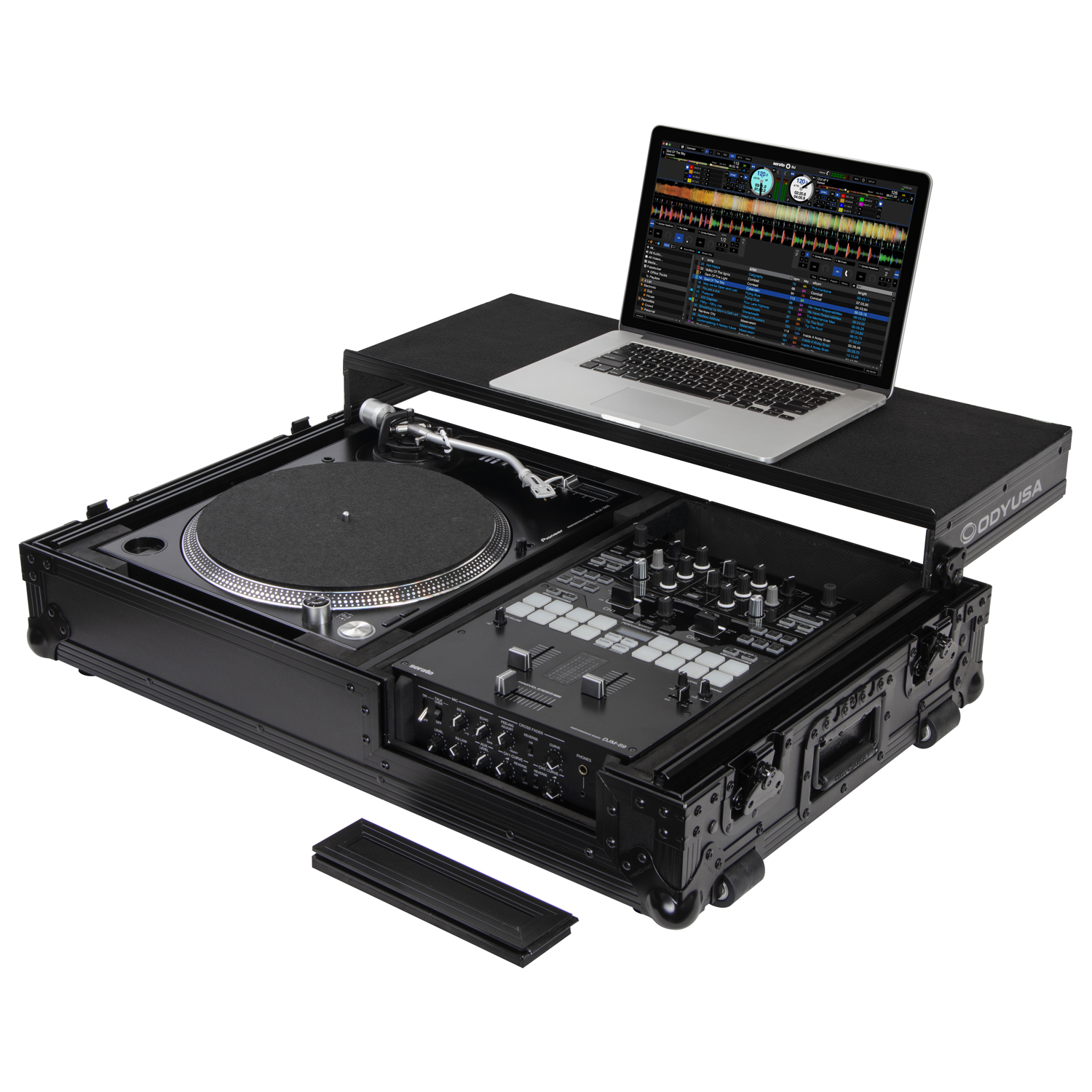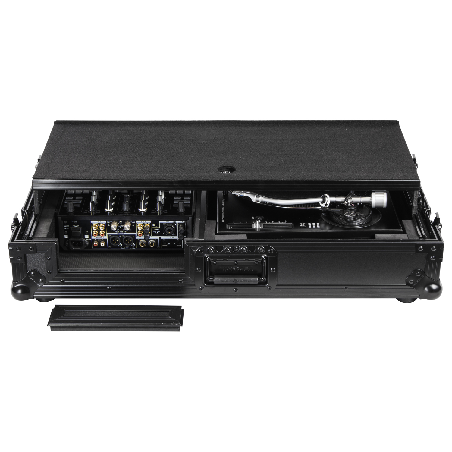 The FZGS1BM10WBL Low Profile Glide Style™ DJ Coffin holds one 10" format mixer and one turntables in battle position. The unique design allows you to configure your setup as you choose with the mixer at he left or right side as preferred, and with its glide platform tension latch rail system you can add our optional Producer Series |GSABL| angled add-on panels. Other features include rugged built-in roller wheels, recessed latches and spring-loaded handles, heavy-duty ball corners, and front and read mixer section V-cut access panels. Cabling is clean and easy with convenient access ports throughout the case. Our turntable DJ coffins can accommodate Technics as well as Numark, Pioneer, Stanton, and similar sized turntables.