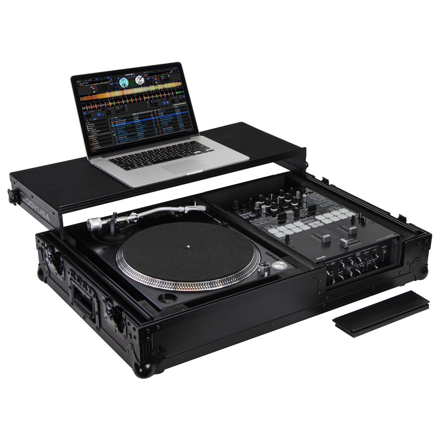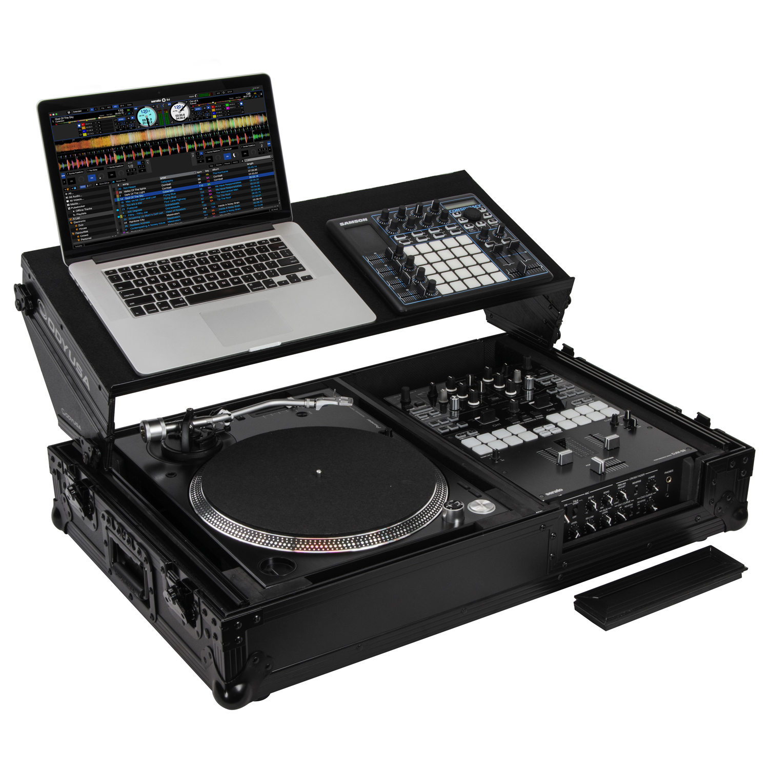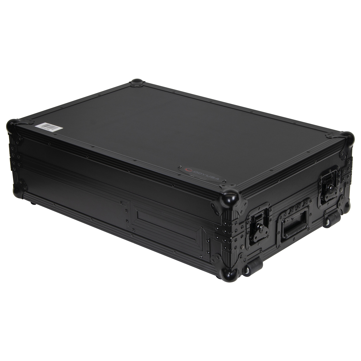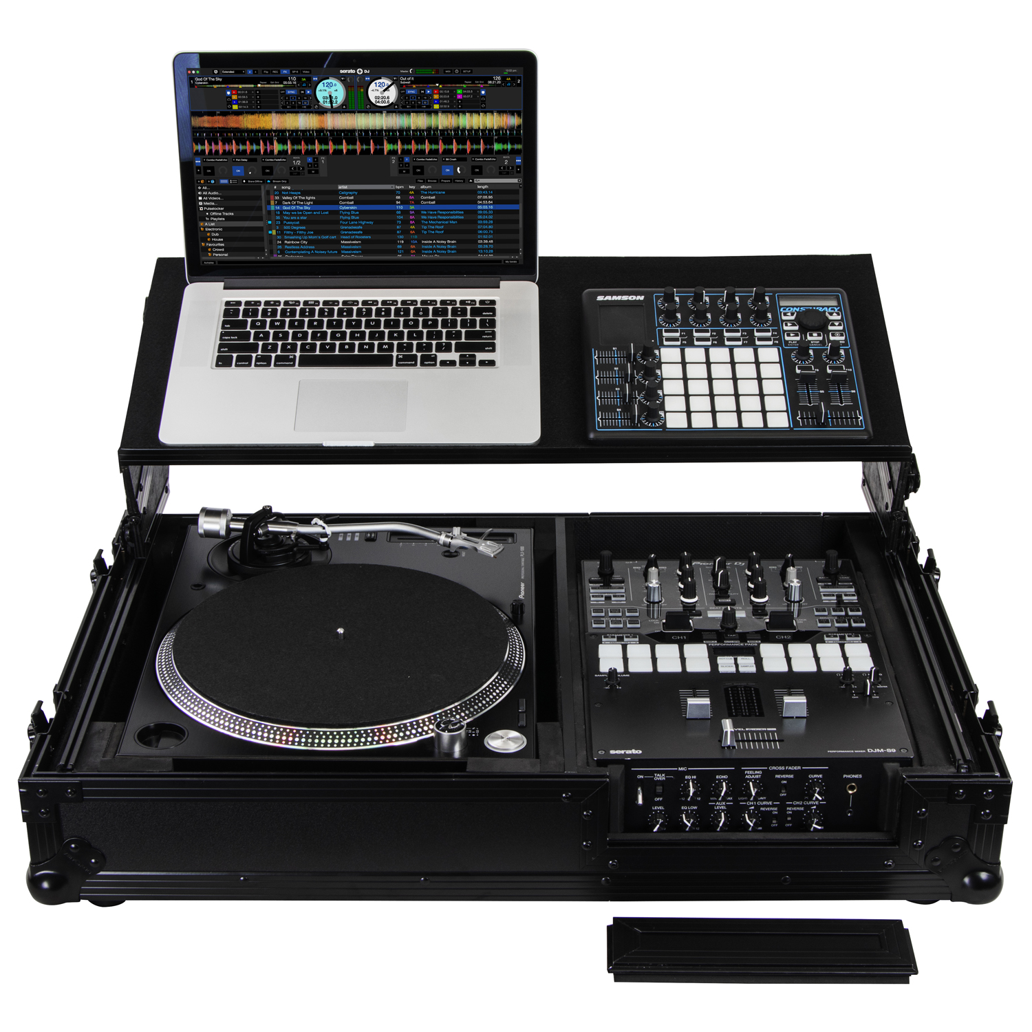 The FZGS1BM10WBL Low Profile Glide Style™ DJ Coffin holds one 10" format mixer and one turntables in battle position. The unique design allows you to configure your setup as you choose with the mixer at he left or right side as preferred, and with its glide platform tension latch rail system you can add our optional Producer Series |GSABL| angled add-on panels. Other features include rugged built-in roller wheels, recessed latches and spring-loaded handles, heavy-duty ball corners, and front and read mixer section V-cut access panels. Cabling is clean and easy with convenient access ports throughout the case. Our turntable DJ coffins can accommodate Technics as well as Numark, Pioneer, Stanton, and similar sized turntables.
