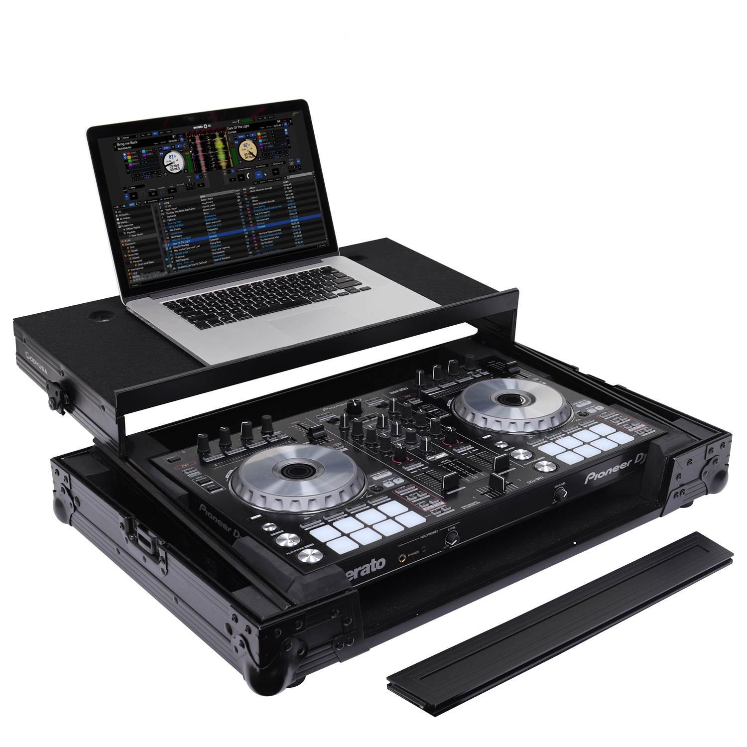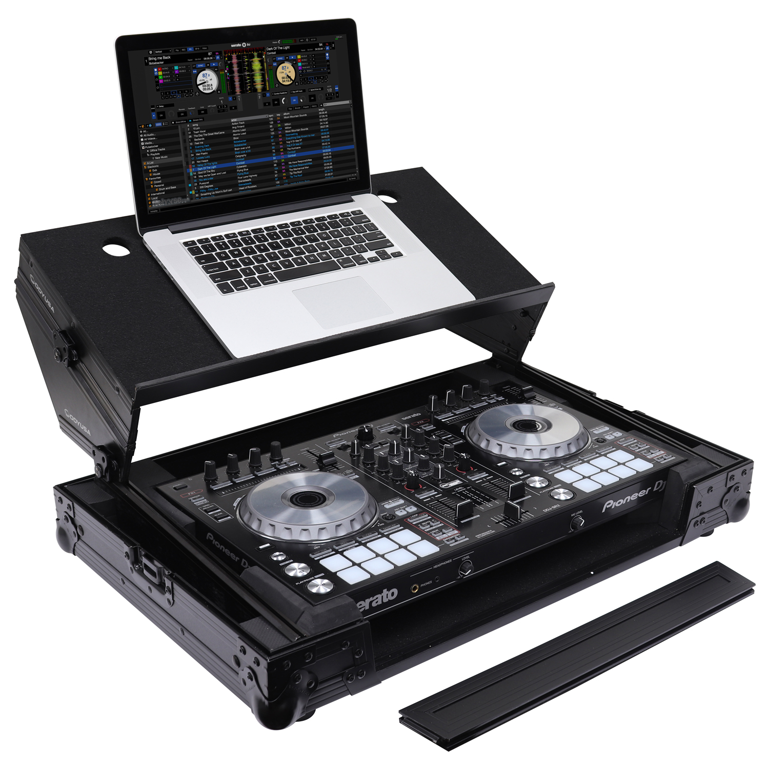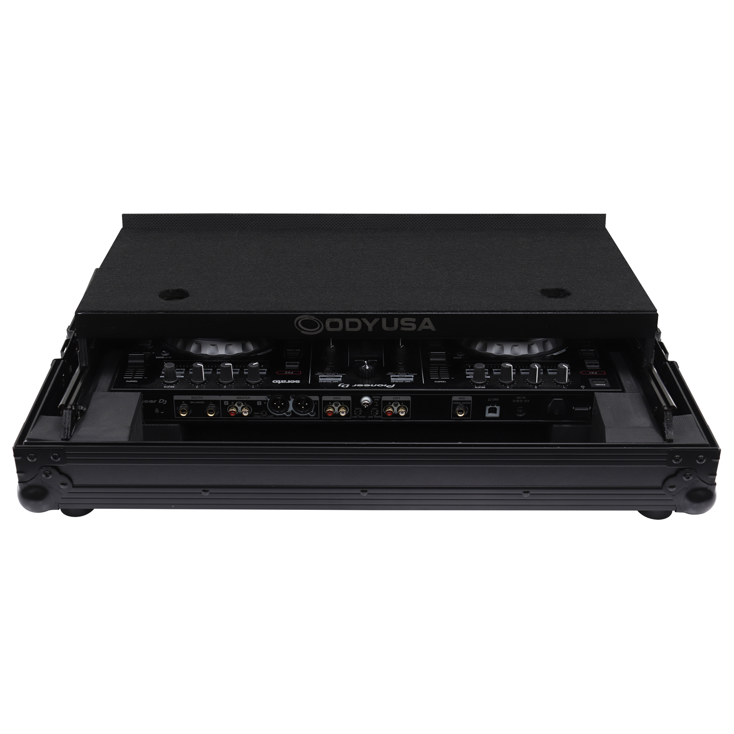 The Odyssey FZGSADDJSR2BL Black Label case includes a removable V-cut front panel allowing access to the all of the Pioneer DDJ-RR, DDJ-SR or DDJ-SR2 controller's front knob controls and input jack ports, and as part of our exciting new 'GSA' Producer Glide Style Series design, it features a new 'angle" to our patented Glide Style platform. Now you can choose to configure the gliding platform in the standard setup with a flat top surface, or add the additional side support panels that are included with the case to position the platform higher and at an angle. Either way, it's perfect for placing your laptop, tablet, effect processor, modular synthesizer, and other gear right where you want over the controller. Enhance your overall performance by using the angled configuration for superior visualization and reach of your remix production gear's knobs, trigger pads, faders, screens, switches, buttons, keys, etc.