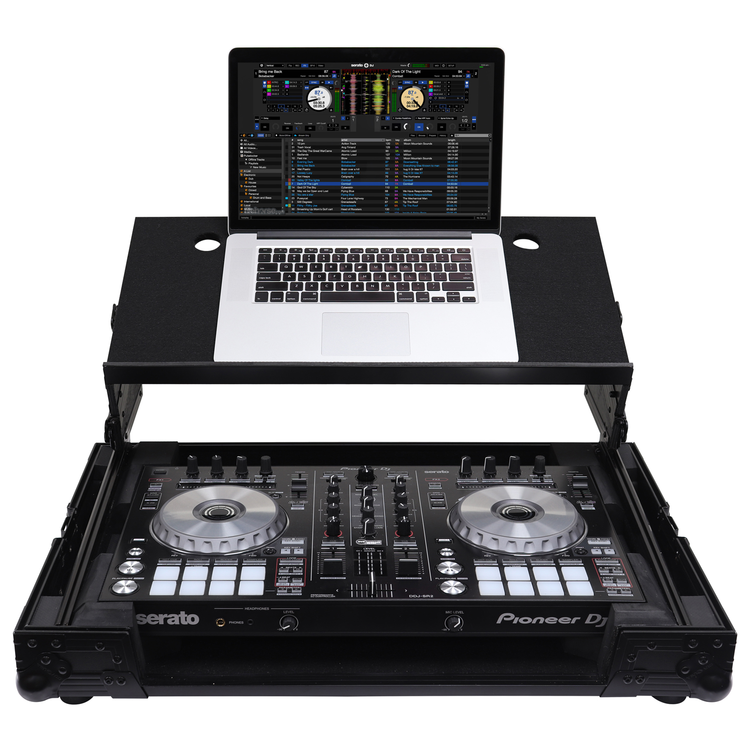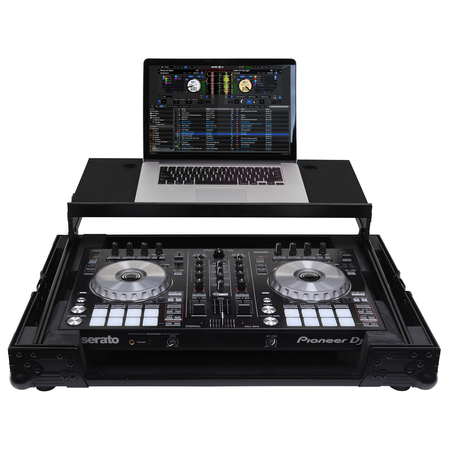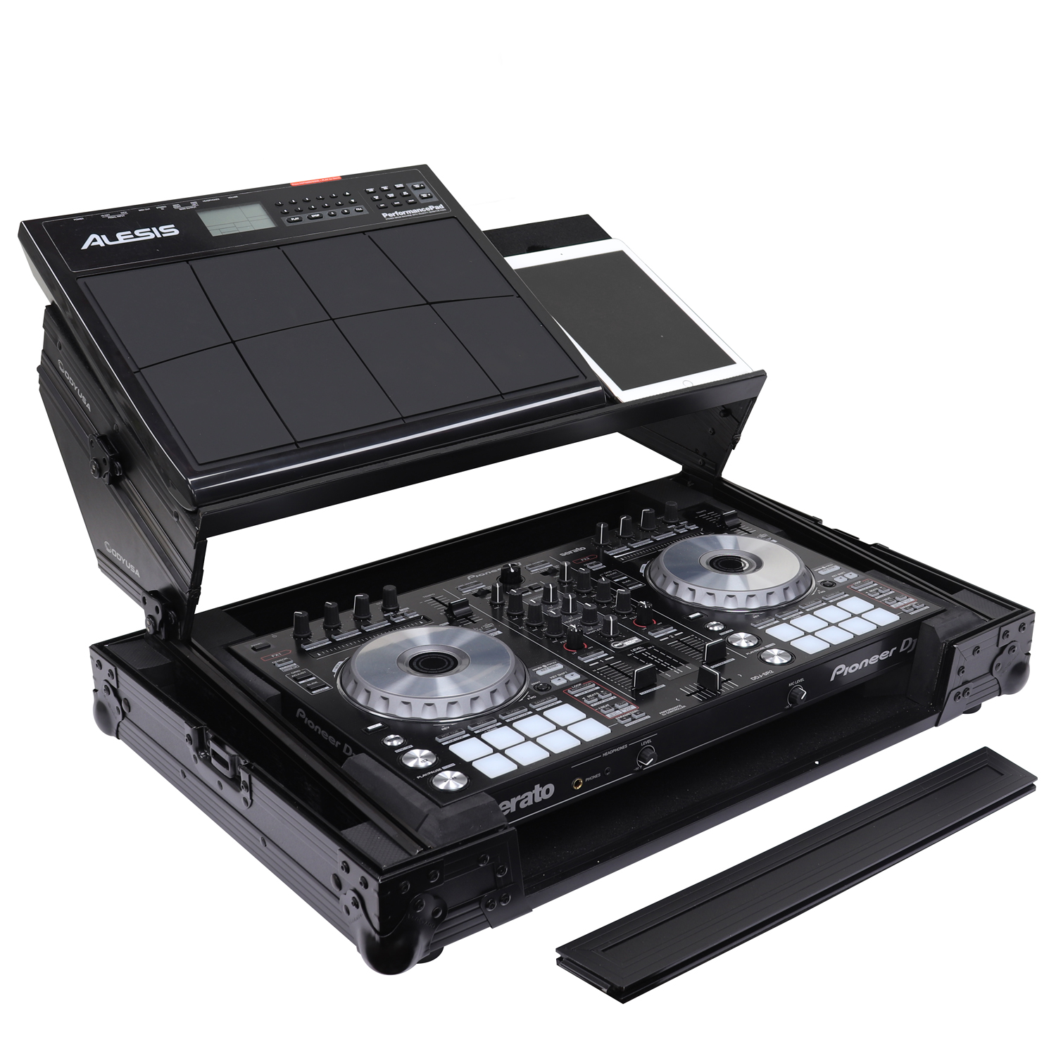 The Odyssey FZGSADDJSR2BL Black Label case includes a removable V-cut front panel allowing access to the all of the Pioneer DDJ-RR, DDJ-SR or DDJ-SR2 controller's front knob controls and input jack ports, and as part of our exciting new 'GSA' Producer Glide Style Series design, it features a new 'angle" to our patented Glide Style platform. Now you can choose to configure the gliding platform in the standard setup with a flat top surface, or add the additional side support panels that are included with the case to position the platform higher and at an angle. Either way, it's perfect for placing your laptop, tablet, effect processor, modular synthesizer, and other gear right where you want over the controller. Enhance your overall performance by using the angled configuration for superior visualization and reach of your remix production gear's knobs, trigger pads, faders, screens, switches, buttons, keys, etc.