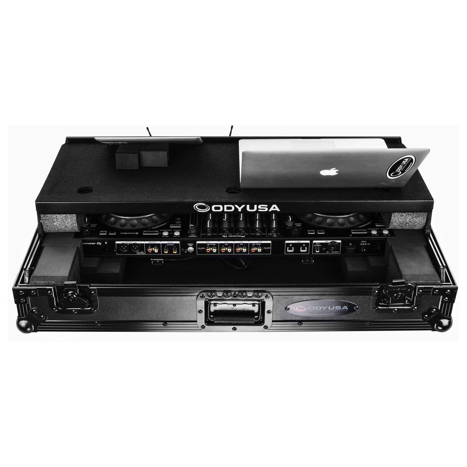 The Odyssey FZGSDDJ1000WGTB Black Label™ case has an extra wide removable front panel allowing proper access to the all of the DJ controller's front knob controls and input jack ports. It features our patented Glide Style™ platform perfect for positioning your laptop, tablet, effect processors, and other gear right where you want it over the Pioneer DDJ-1000 or DDJ-1000SRT controller. A cable management port, essential for a clean setup, is positioned below the rear of the player. Also Underneath the controller compartment is another one of Odyssey's signature digital controller case designs; an integrated convenient pullout tray shelf, perfect for placing your hard drive(s), headphones, smart phones, and other essentials out of sight while you show off your mix and tricks.