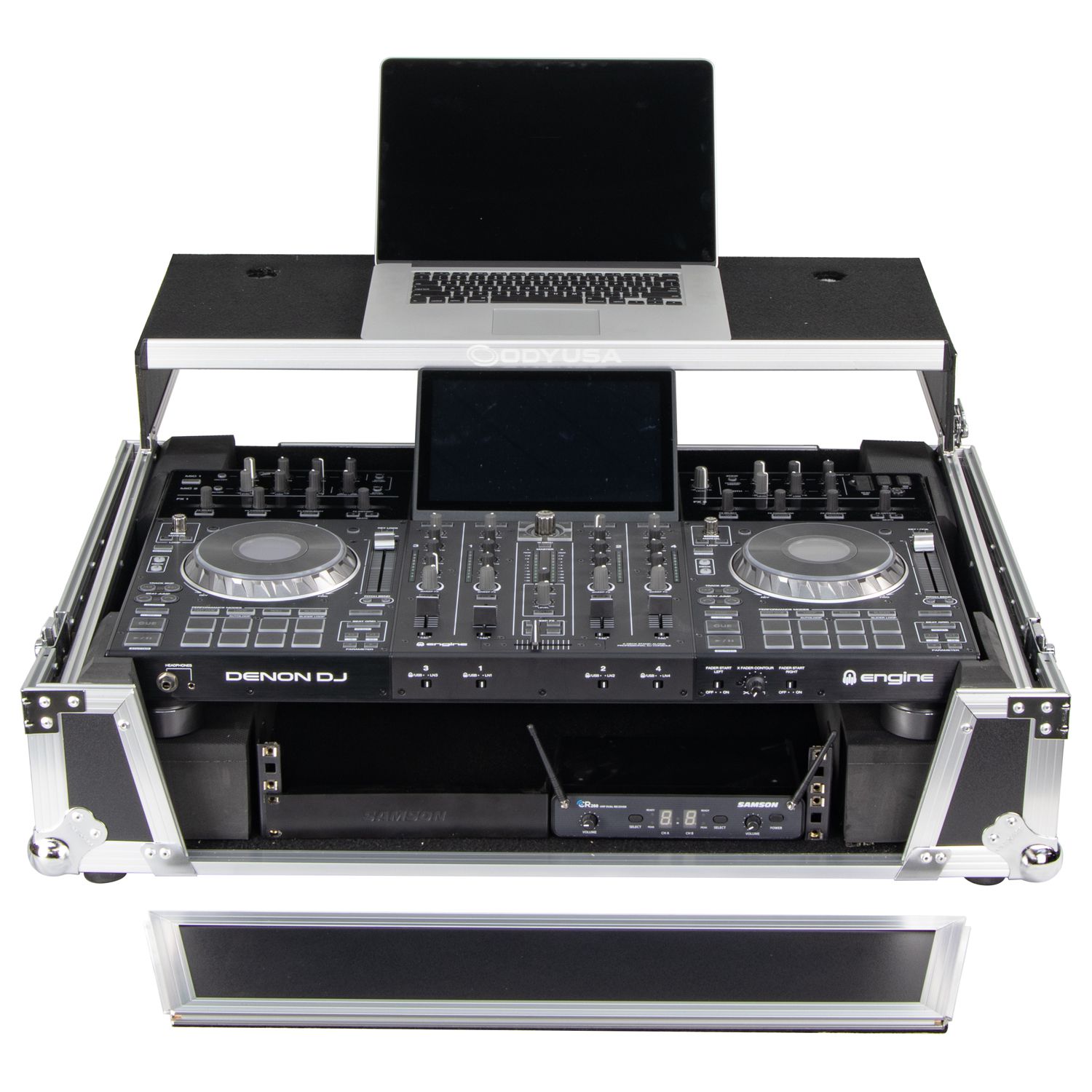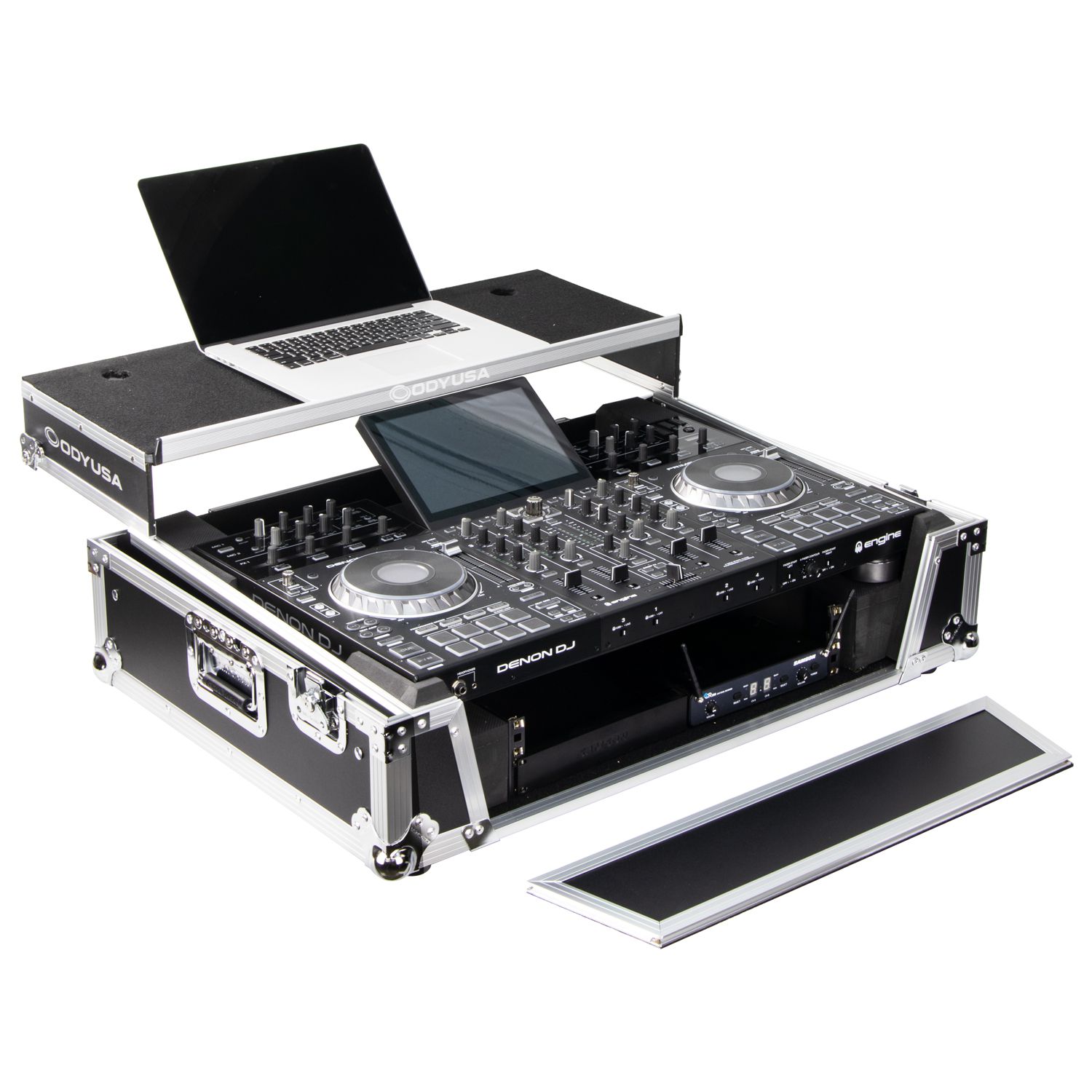 The Odyssey FZGSPRIME4W2 Flight Zone® case includes a removable V-cut™ front panel allowing access to the all of the DJ controller's front knob controls and input jack ports. It features our patented Glide Style™ platform perfect for positioning your laptop, tablet, effect processors, and other gear right where you want it over the Prime 4 controller. A cable management port, essential for a clean setup, is positioned below the rear of the player. Also Underneath the controller compartment is another one of Odyssey's signature digital controller case designs; a 2U 19" rack mount space below the controller space perfect for rack mount gear such as wireless mic systems, power strip, drive rack, or storage drawer. The mounting hardware included allows for front or rear rack mounting and can be removed all together if needed.